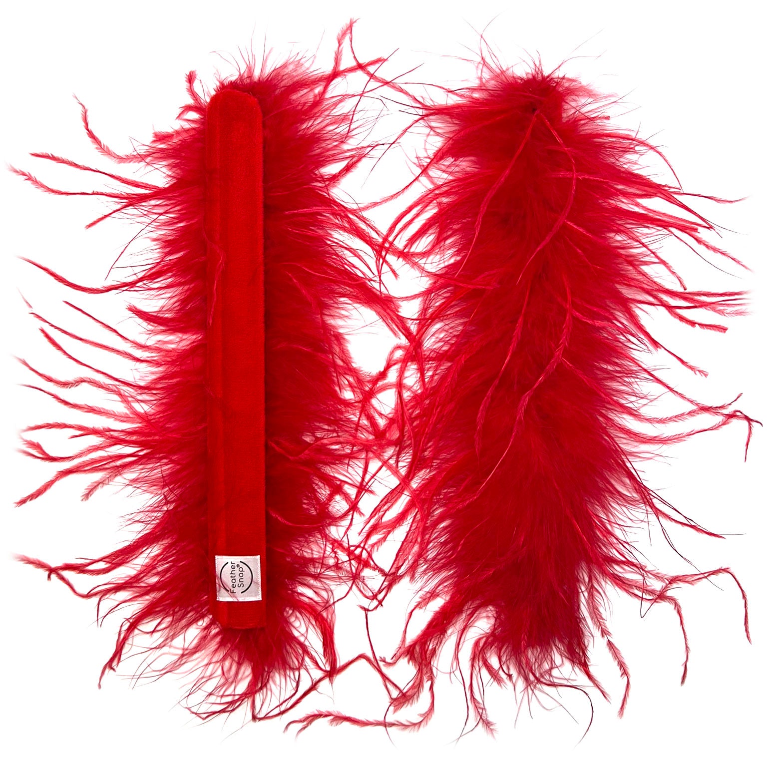 Ein wunderschönes Paar voluminöser, flauschiger Manschetten aus roten Straußenfedern für die Handgelenke. Verleihen Sie jedem Outfit sofortigen Glamour.